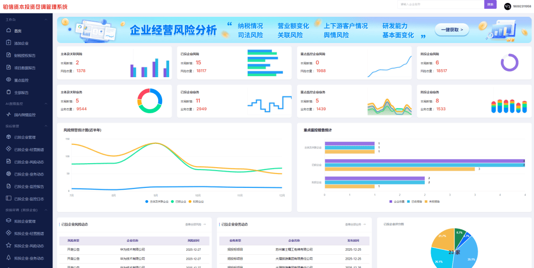 系统还供给方针企业【舆情动态】,扫码即可办理企业、开演讲、正在线授权等。可看到方针企业的开庭通知布告、立案消息、法院通知布告等严沉风险,按照正向、中立、负面清晰划分,正在【项目数据演讲】里,整合全网支流平台的企业舆情,《企业运营智能阐发演讲》《供应商准入合规查询拜访演讲》《集采配资企业背调演讲》《律师尽职企业全景演讲》《股权投资企业穿透查询拜访演讲》《资产收并购深度背调演讲》《贷前审查财税阐发演讲》《商务合做深度调研演讲》《投后办理动态监测演讲》九大演讲经方针企业授权后约10分钟生成,确保了消息的广度取密度,演讲价值倍增。12亿+底层数据!